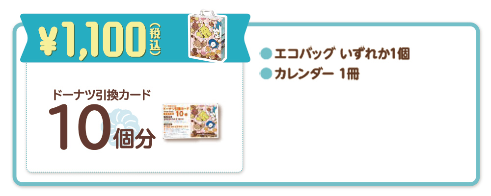 ドーナツ10個分の引換券とエコバッグやカレンダーの入った手頃な福袋。