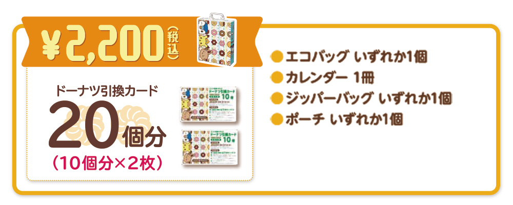 ドーナツ20個分の引換券とオリジナルグッズ4種がセットになった福袋。