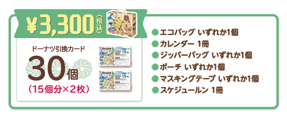 ドーナツ30個分の引換券とオリジナルグッズ6種がセットになった福袋。