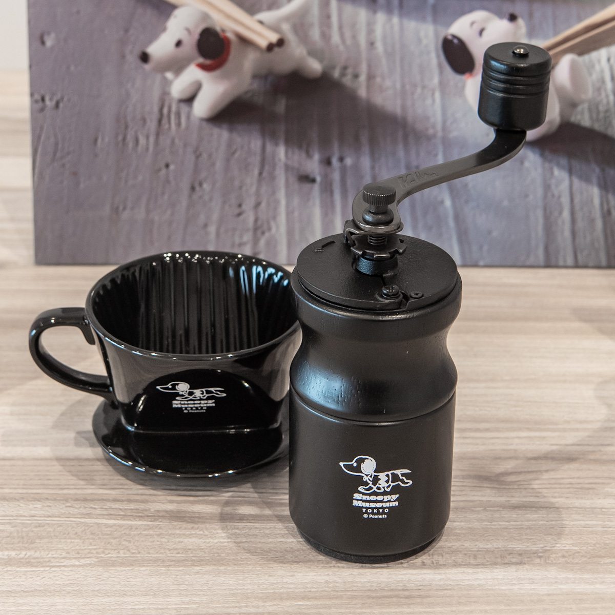 シックな黒のボディにジグザグの服を着た「スヌーピー」のワンポイントがおしゃれなKalitaのコーヒーアイテム。