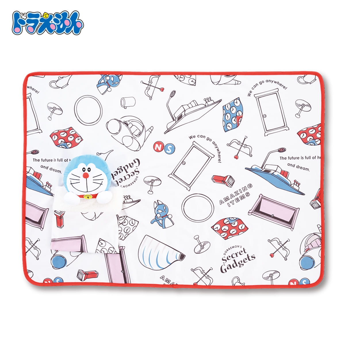 タイムマシンやタケコプターなど、「ドラえもん」を代表する”ひみつ道具”がデザインされたブランケット。