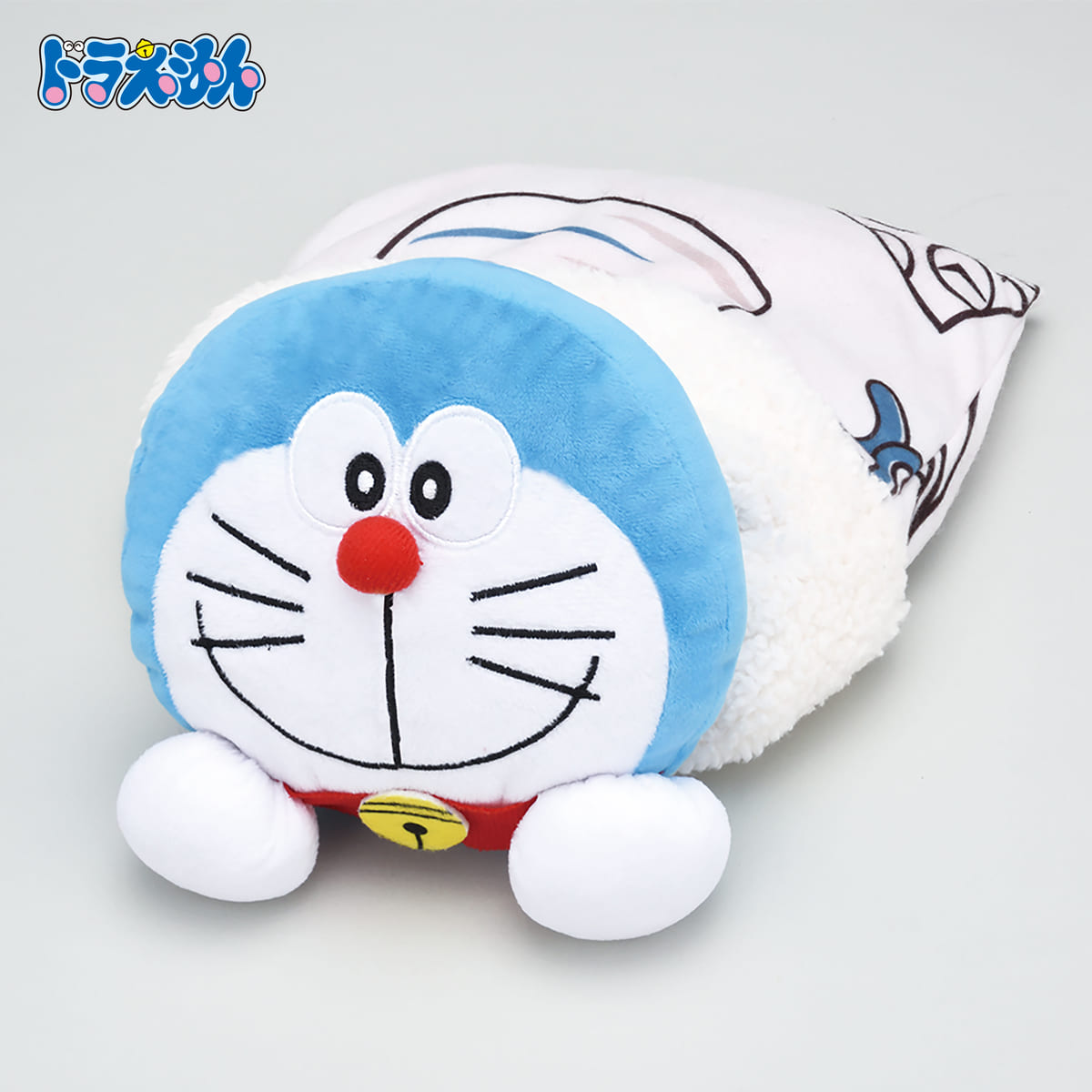 ふわふわのブランケットに包まれた「ドラえもん」に沿って折り畳むと、ぬいぐるみに変身します!
