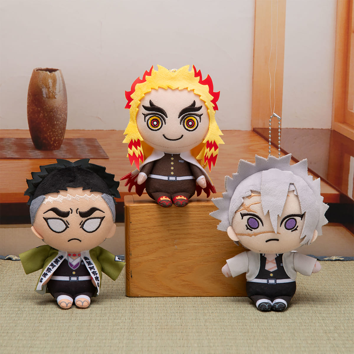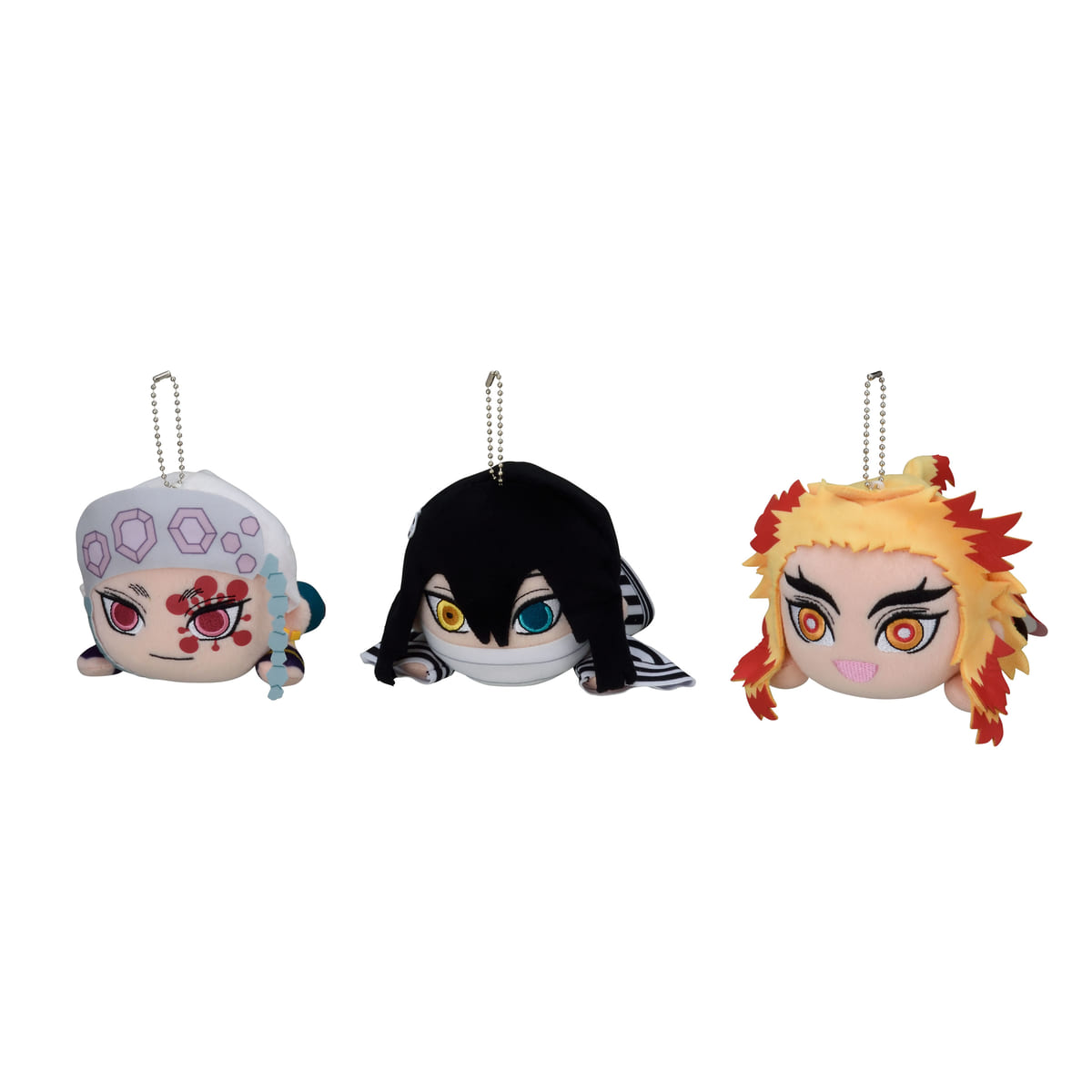 「宇髄天元」「伊黒小芭内」「煉獄杏寿郎」の3人が、うつぶせに寝そべった、かわいらしいボールチェーン付きのぬいぐるみです。