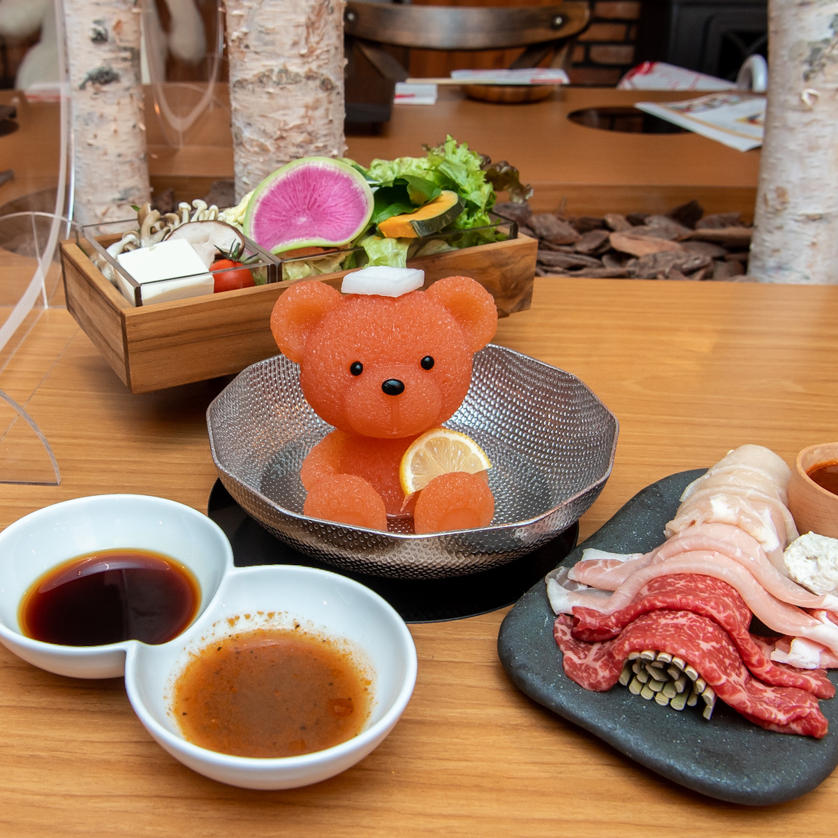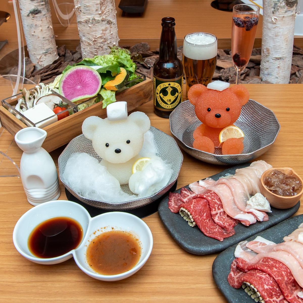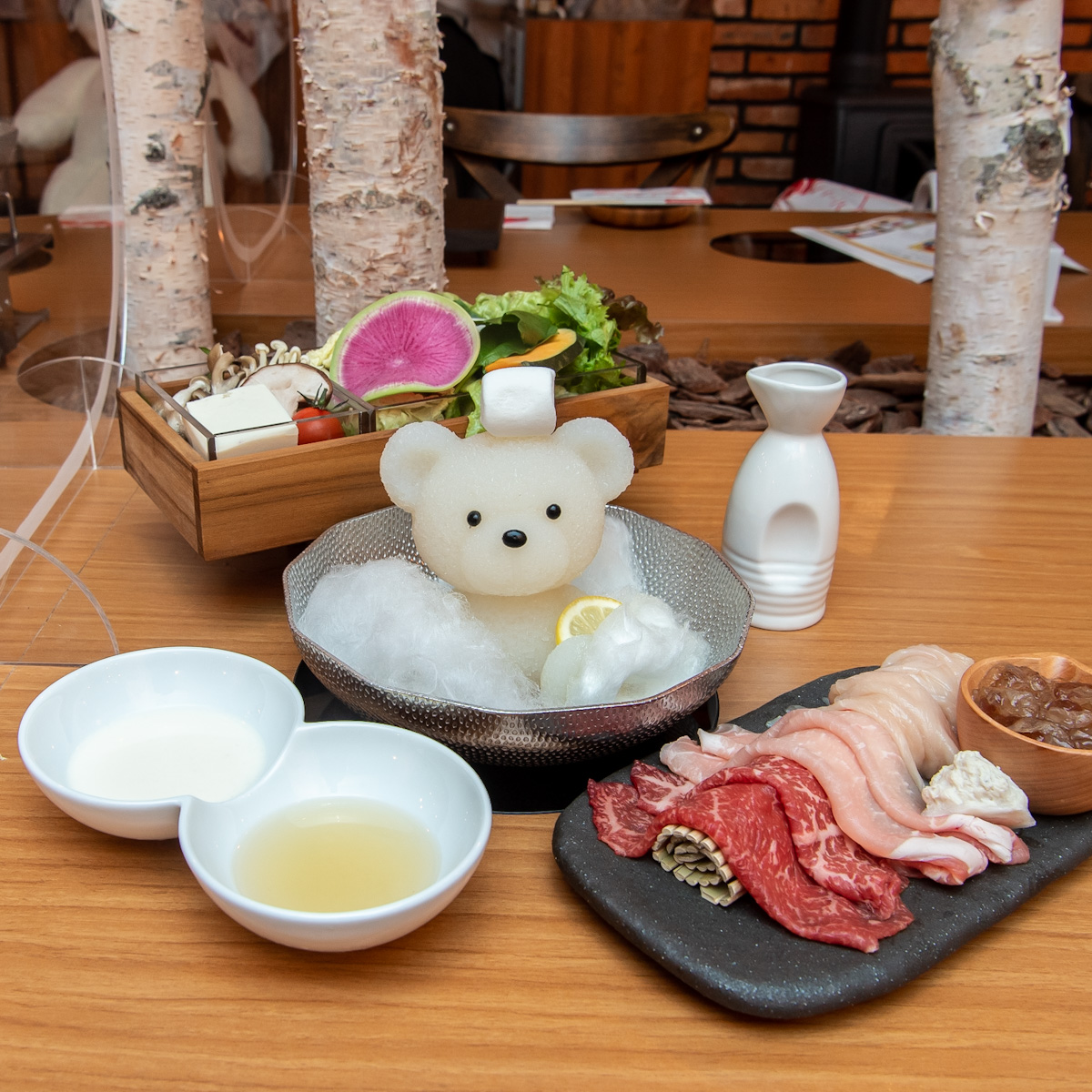 「北海道めんこい鍋 くまちゃん温泉」は、北海道の美味しい食材をワクワクしながら楽しめるよう、見るだけで癒してくれるかわいいくまちゃんをしゃぶしゃぶ鍋の出汁にした新感覚の一人鍋専門店。