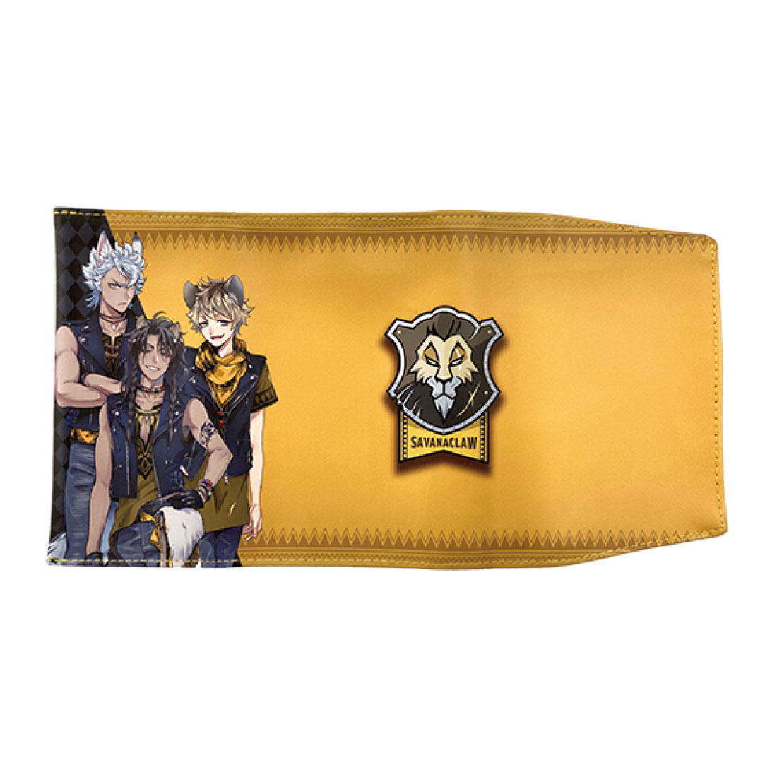 「サバナクロー寮」に所属する3人の制服の着こなしが楽しめる集合イラストをオモテ面に配したフラットポーチ。