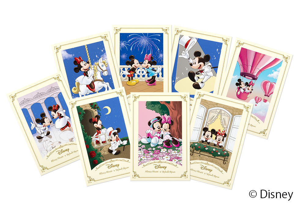 いろんな場面でデートを楽しむ「ミッキーマウス」と「ミニーマウス」が描かれた、全8種類の中からランダムで2枚が封入されます。