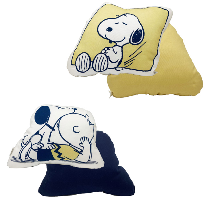 「スヌーピー」と一緒にリラックスできる黄色いクッションのダイカットクッション。
