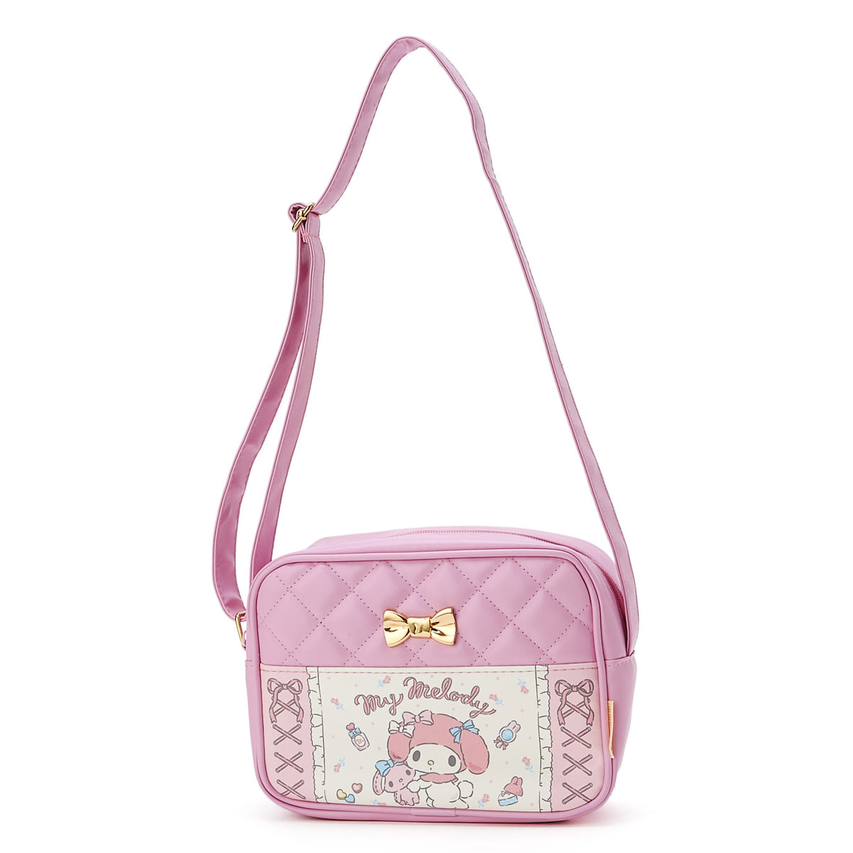「マイメロディ」のかわいいショルダーバッグに、お菓子が入っています。