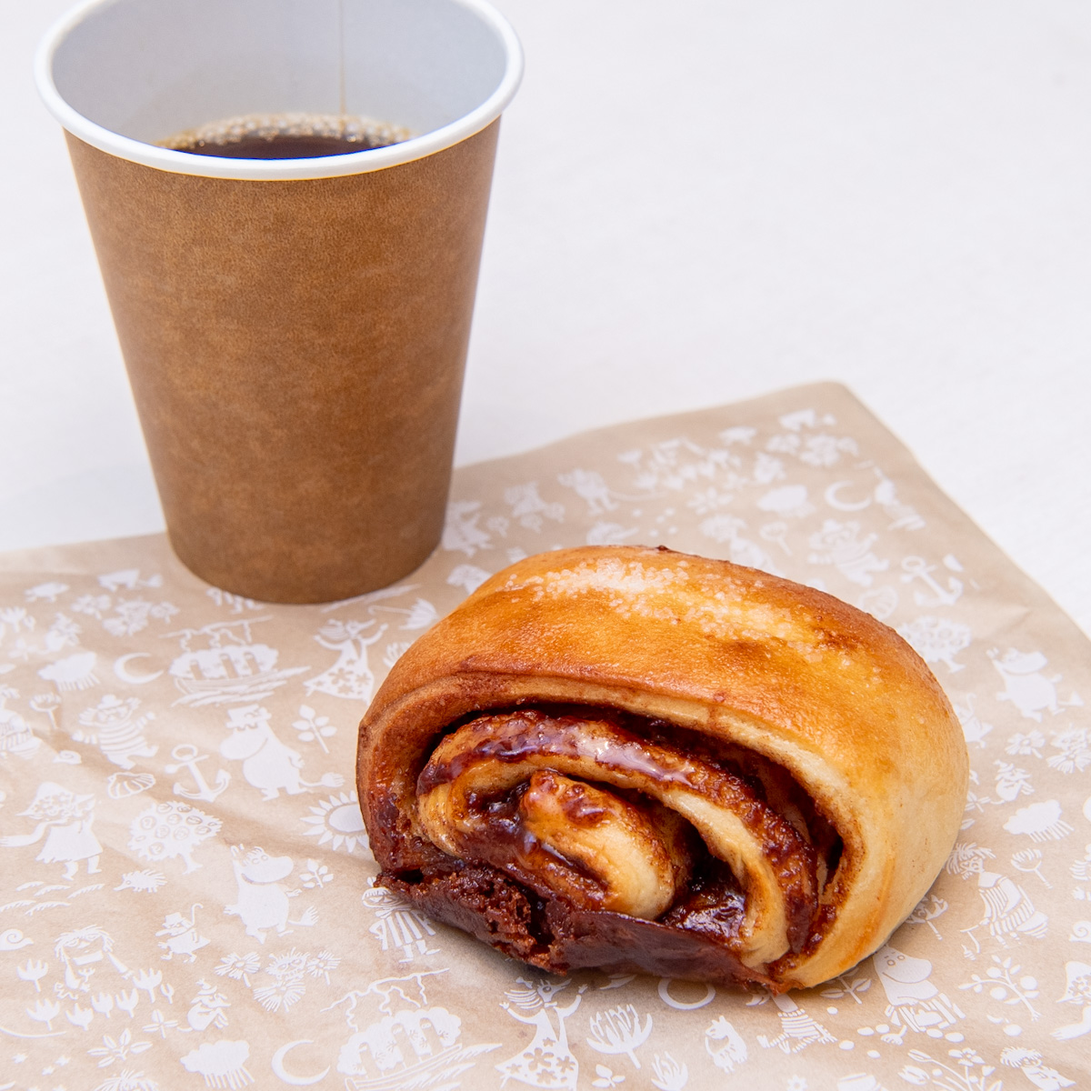 シナモンロールなどのパンは、ムーミンの物語に登場するモチーフがいっぱい描かれた楽しいパッケージで提供されます。
