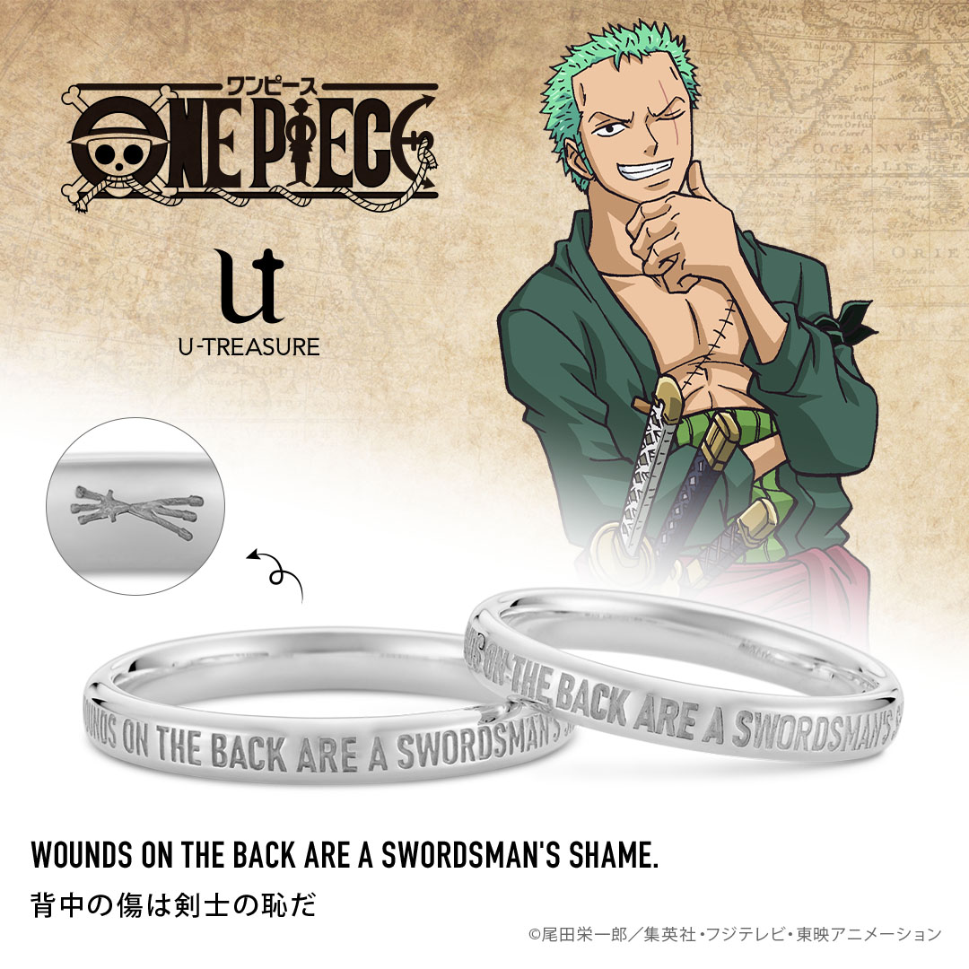 「WOUNDS ON THE BACK ARE A SWORDSMAN'S SHAME.(背中の傷は剣士の恥だ)」と刻まれた、「ロロノア・ゾロ」デザインのブライダルリング。
