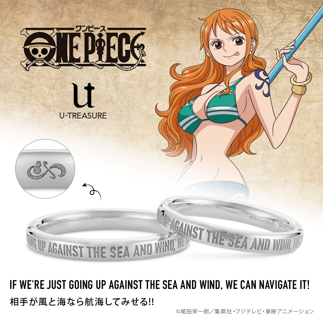 「IF WE'RE JUST GOING UP AGAINST THE SEA AND WIND, WE CAN NAVIGATE IT!(相手が風と海なら航海してみせる!!)」と刻まれた、「ナミ」デザインのブライダルリング。