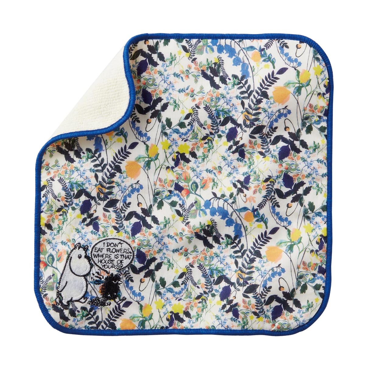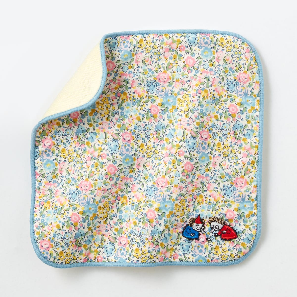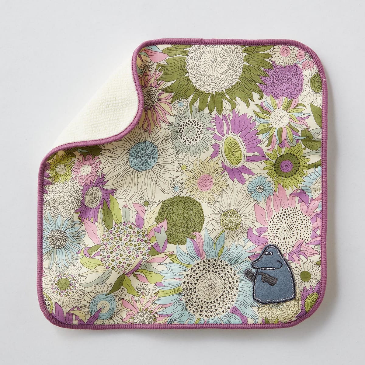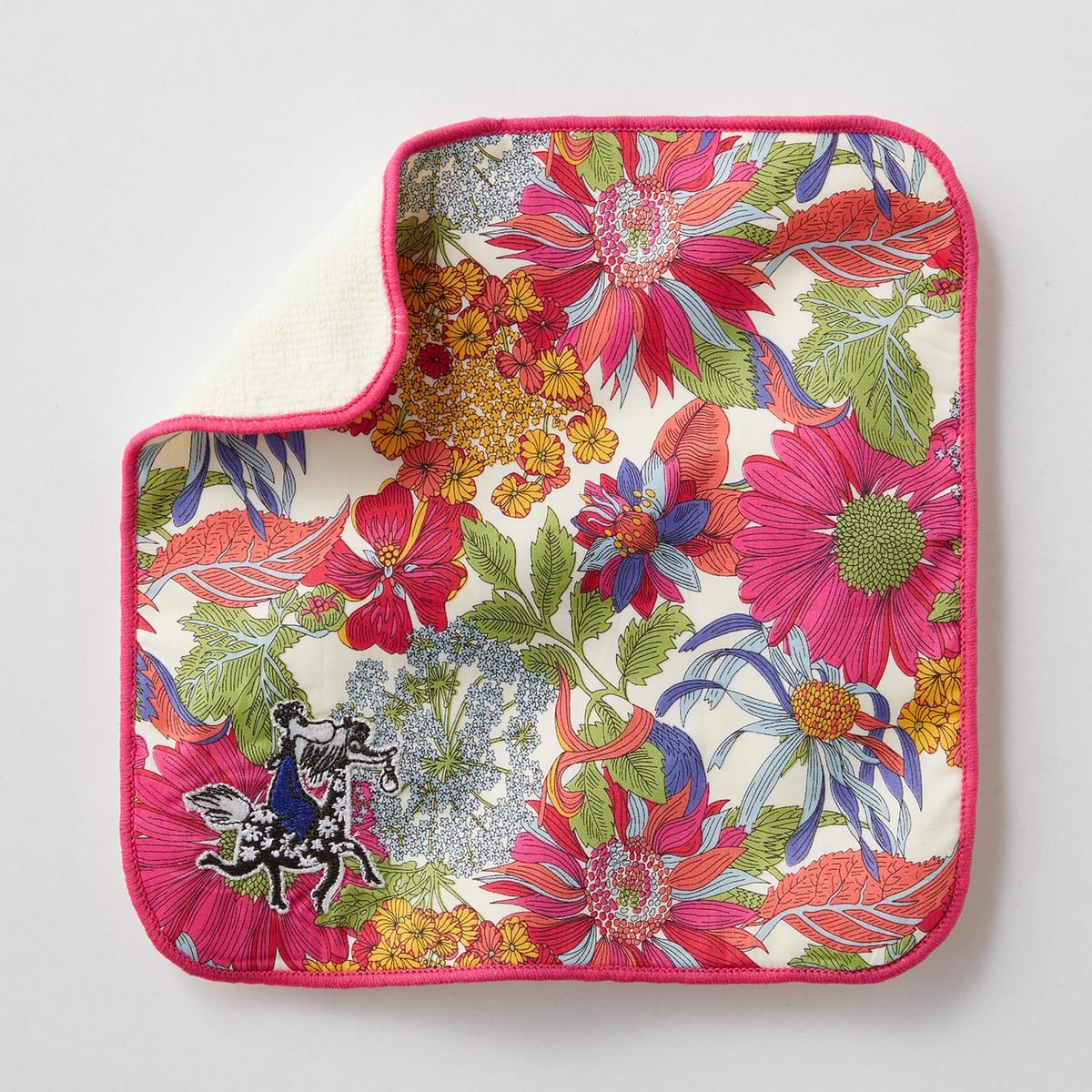 大ぶりな花柄の隅に、冷気をまとう魔物「モラン」のアップリケを施したリバティハンカチ。