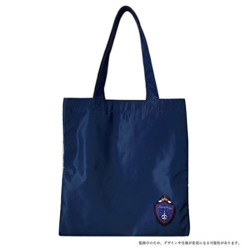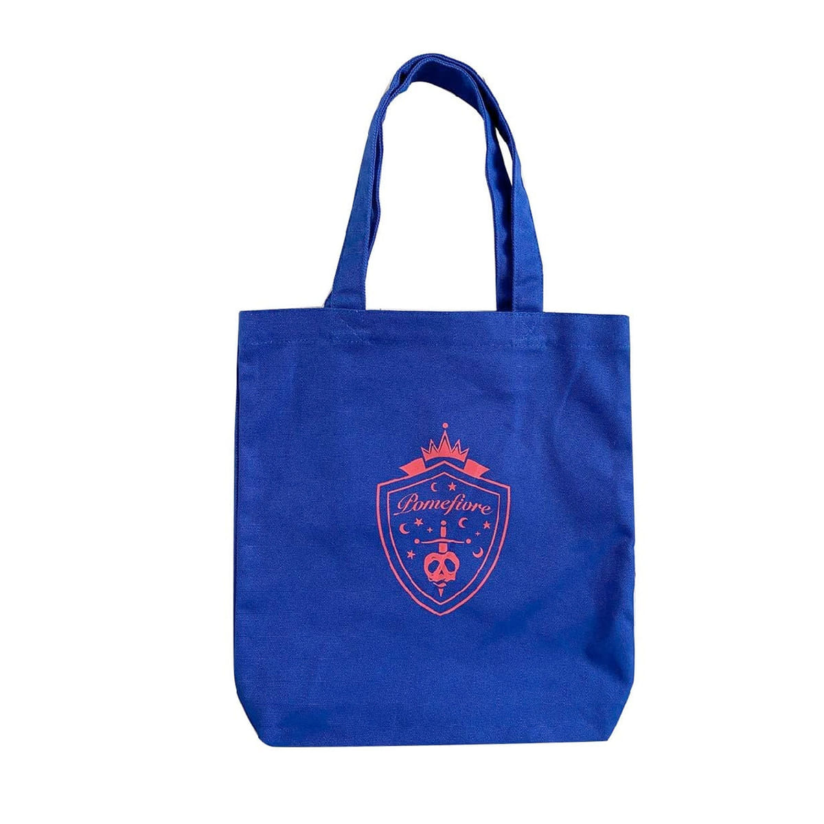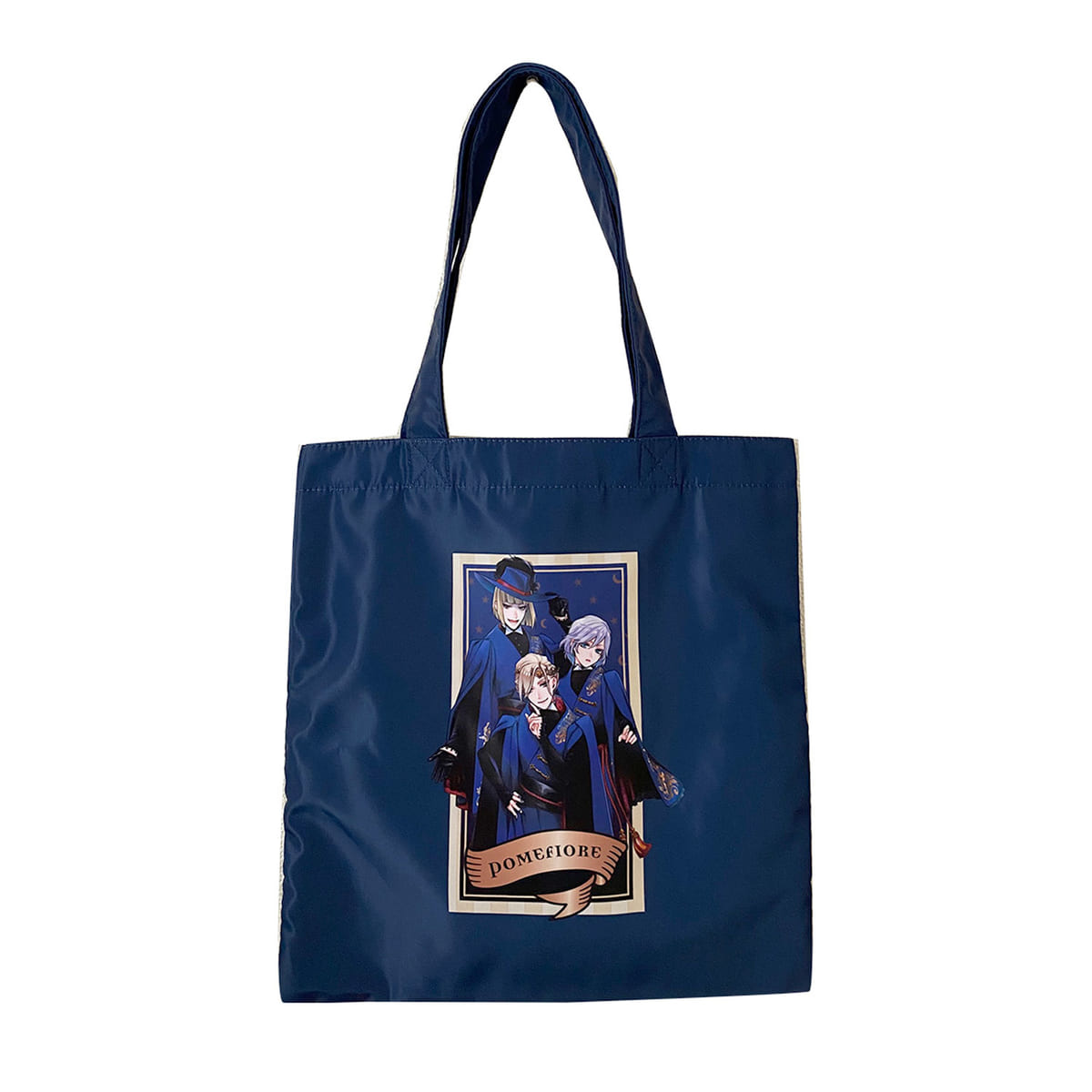 コーデのアクセントにもなるブルーのトートに、「ポムフィオーレ寮」のエンブレムが大胆にデザインされています。