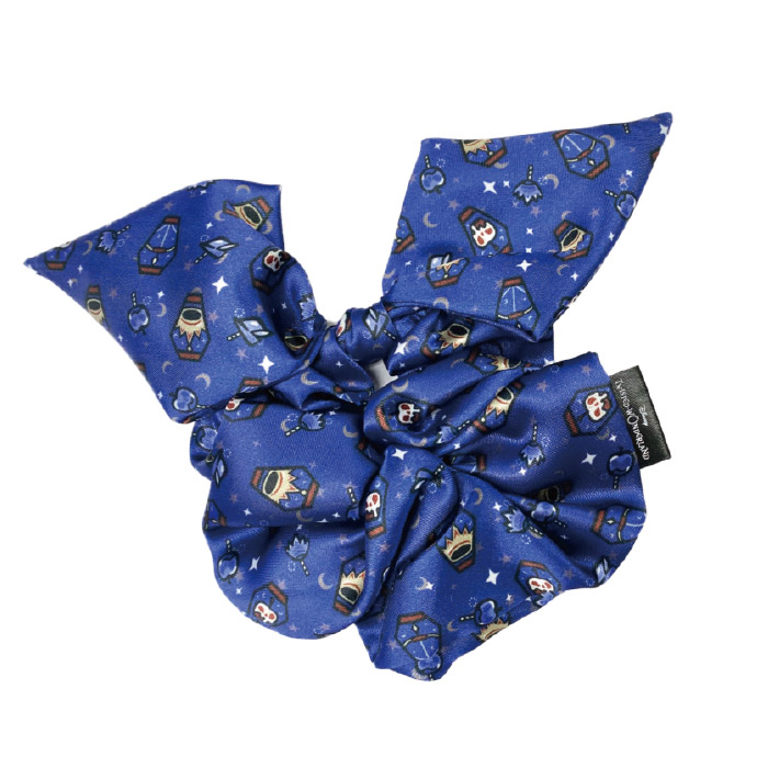 深みのあるブルーにキャラクターアイコンを散りばめたパターン柄のシュシュ。