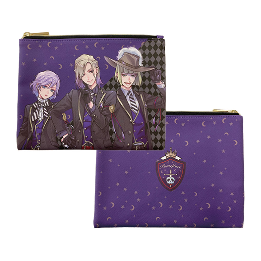 制服姿の「ポムフィオーレ寮」寮生たちの美麗イラストをプリントしたフラットポーチ。