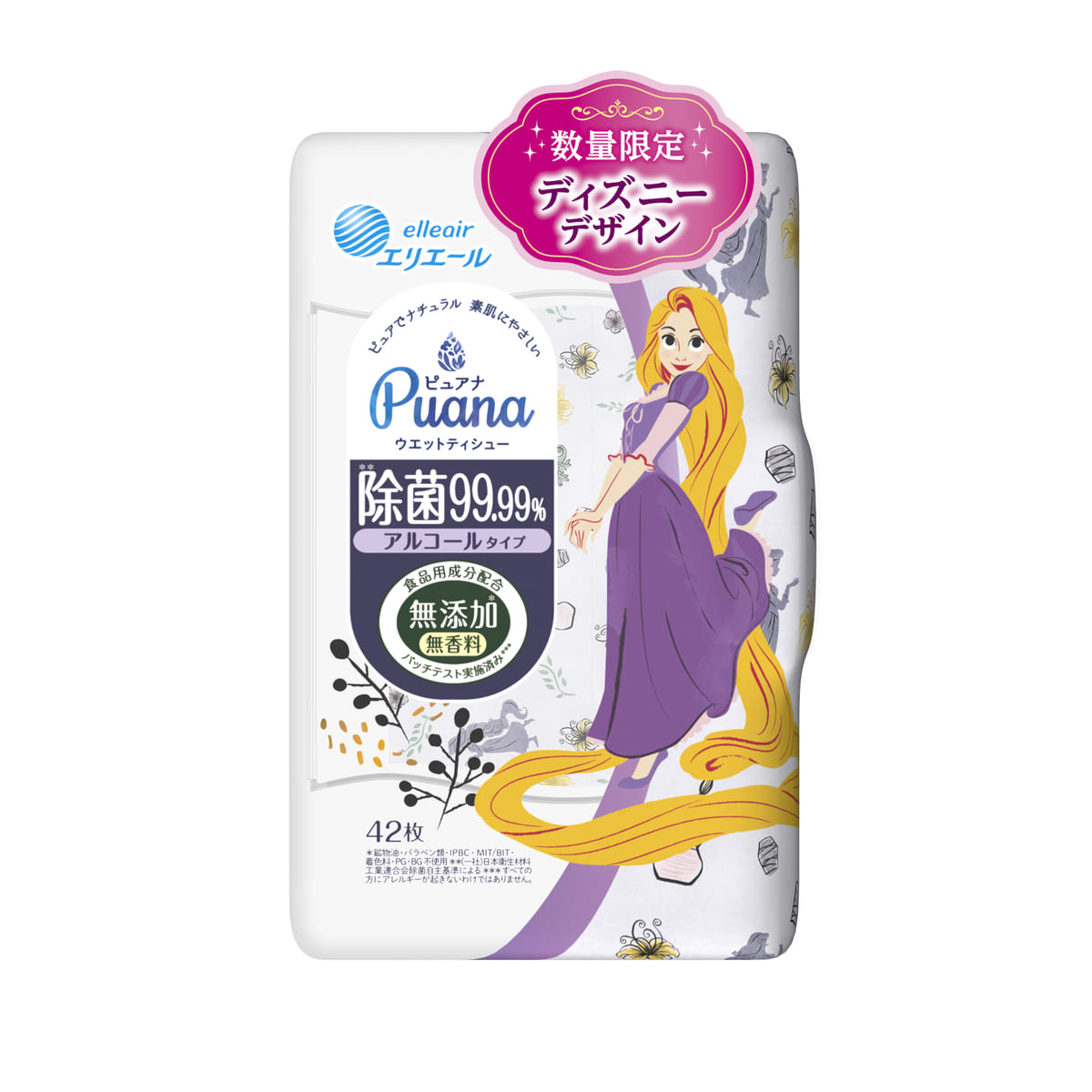 ピュアナ ウエットティシュー 除菌99.99%アルコールタイプのパッケージには『塔の上のラプンツェル』よりディズニープリンセスの「ラプンツェル」が登場。