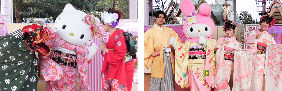 開催日の16時からは「ハローキティ」「マイメロディ」「クロミ」「シナモロール」らが晴れ着で登場!