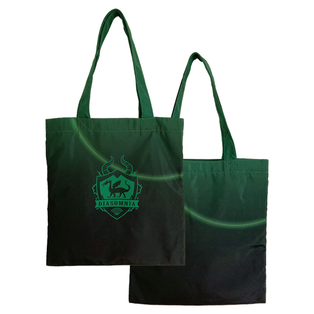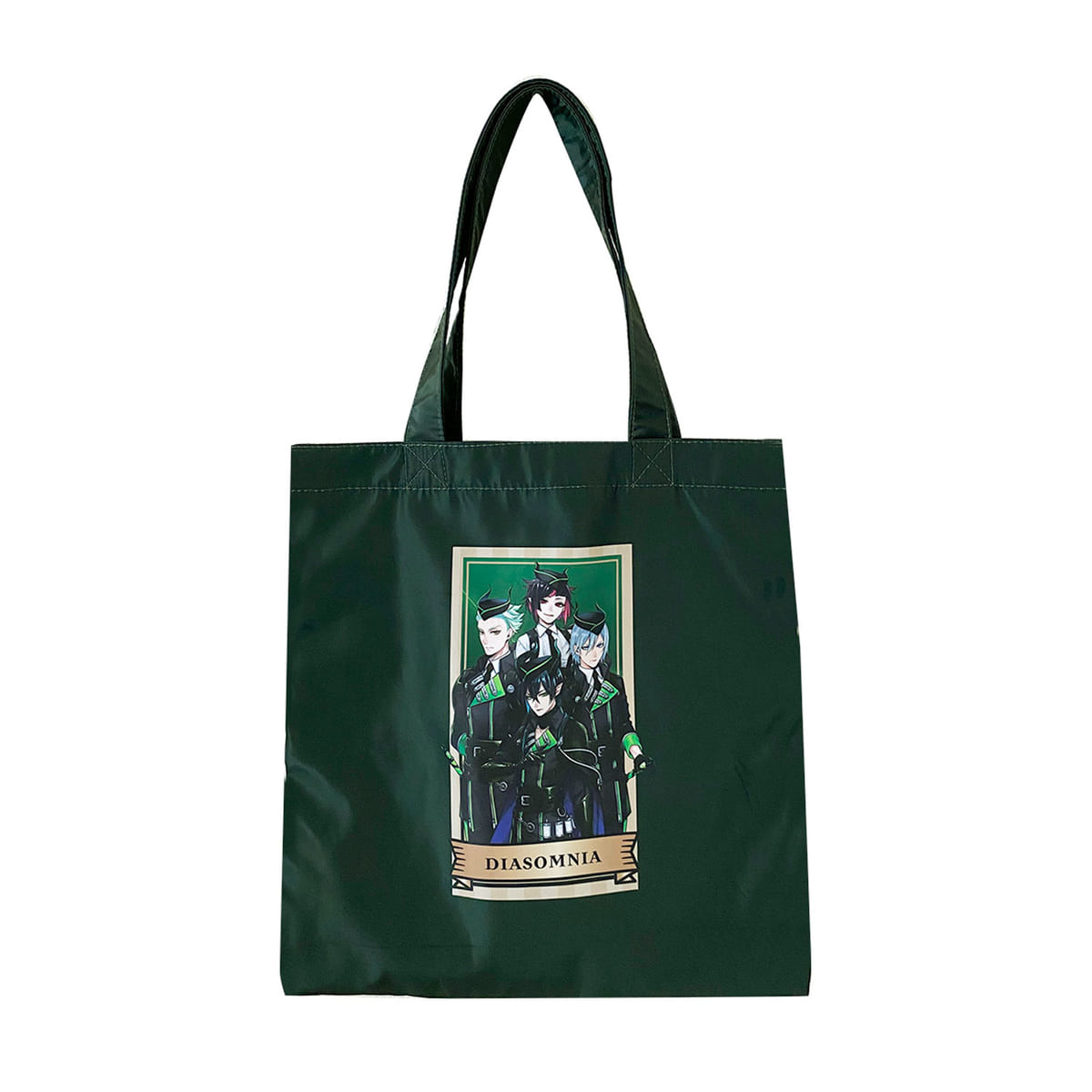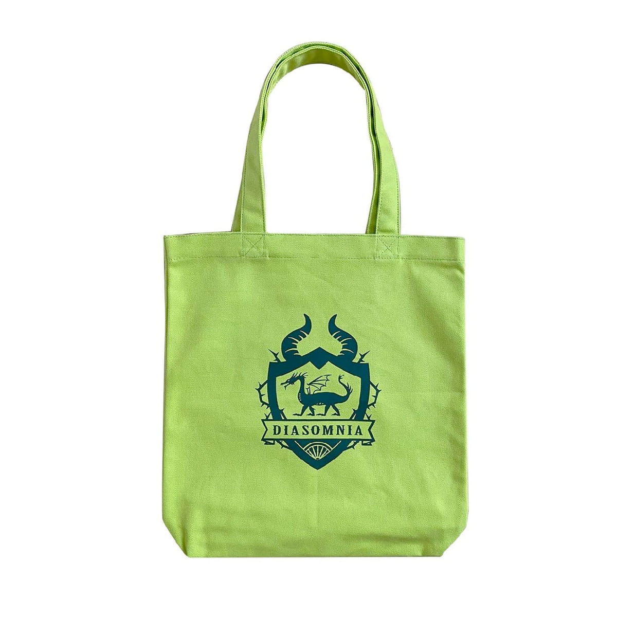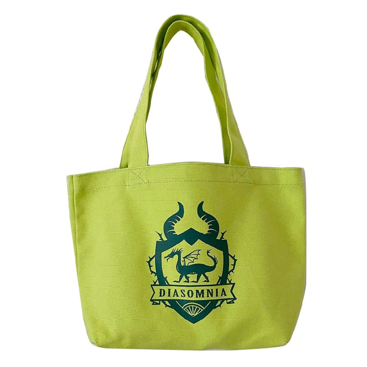 ライムグリーン×ダークグリーンで表現された「ディアソムニア寮」デザインのコットンランチバッグ。