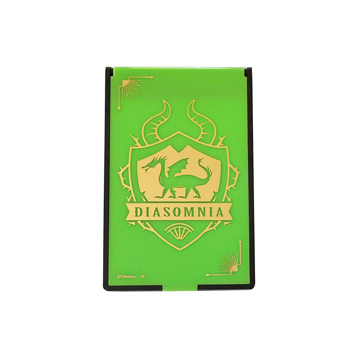 「ディアソムニア寮」をイメージしたイエローグリーンにゴールドの箔押しで寮章があしらわれたミラー。