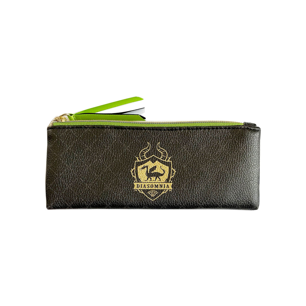「ディアソムニア寮」のエンブレムをゴールドであしらい、引き手にイエローグリーンとブラックのリボンを付けたデザインです。