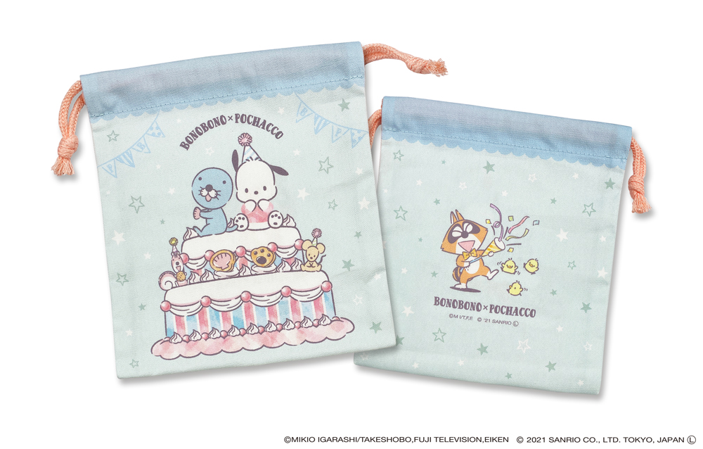 「ポチャッコ」がアニバーサリーを祝うパーティーを開いてくれたというコンセプトストーリーが描かれた「巾着」