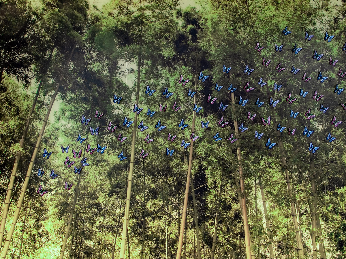 竹やぶの中を、青い蝶が舞う幻想的な背景、
