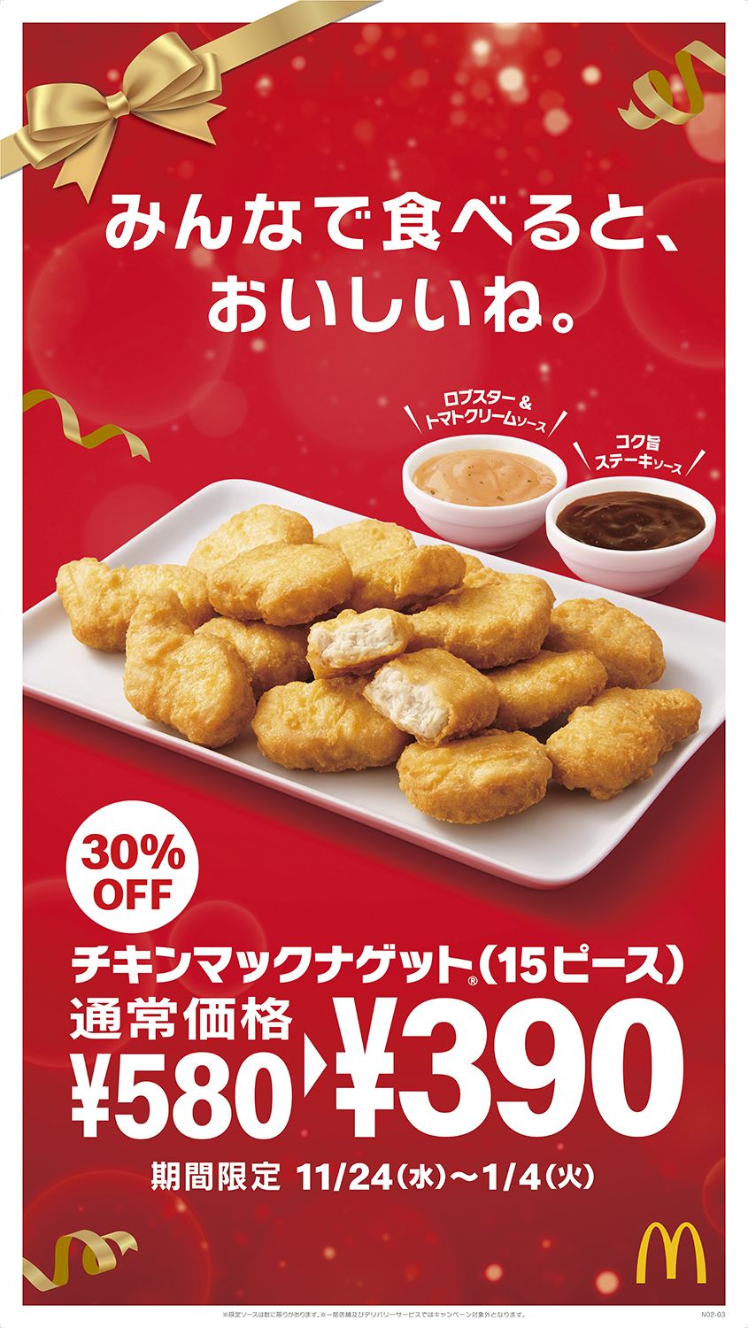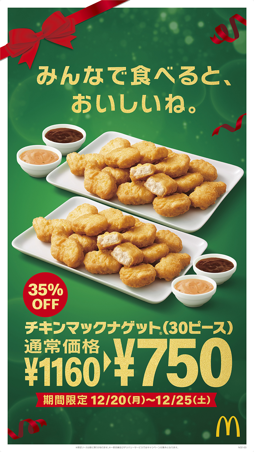 12月20日(月)から12月25日(土)までの6日間、「チキンマックナゲット30ピース(ソース6個付き)」が、35%OFFの特別価格750円(税込)で販売になるお得なキャンペーンを開催!