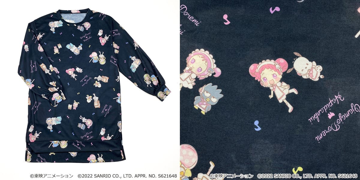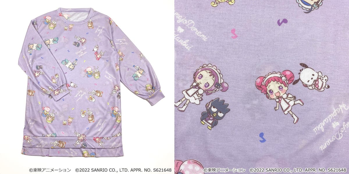 ロング丈のTシャツやチュニックとしても、ワンピースとしても楽しめる「おジャ魔女どれみ×はぴだんぶい 総柄ワンピース」