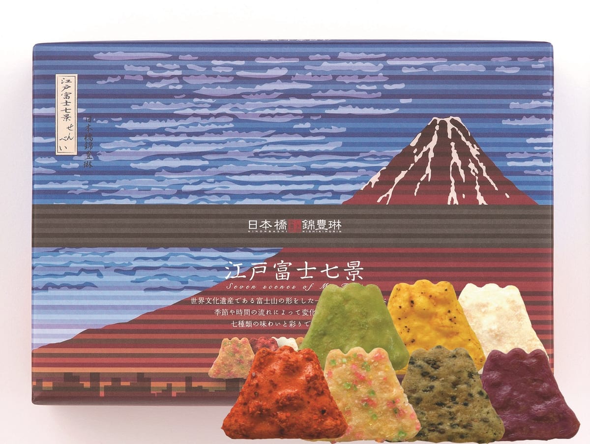 「日本橋錦豊琳」の「江戸富士七景」は、世界文化遺産登録された富士山をかたどった、ひとくちサイズのおせんべいです。