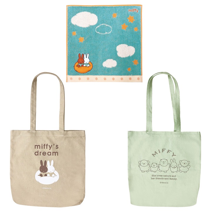 お空で一緒のひとときを過ごす「ミッフィー」と「メラニー」が可愛いタオルハンカチは毎日使いたいグッズ。