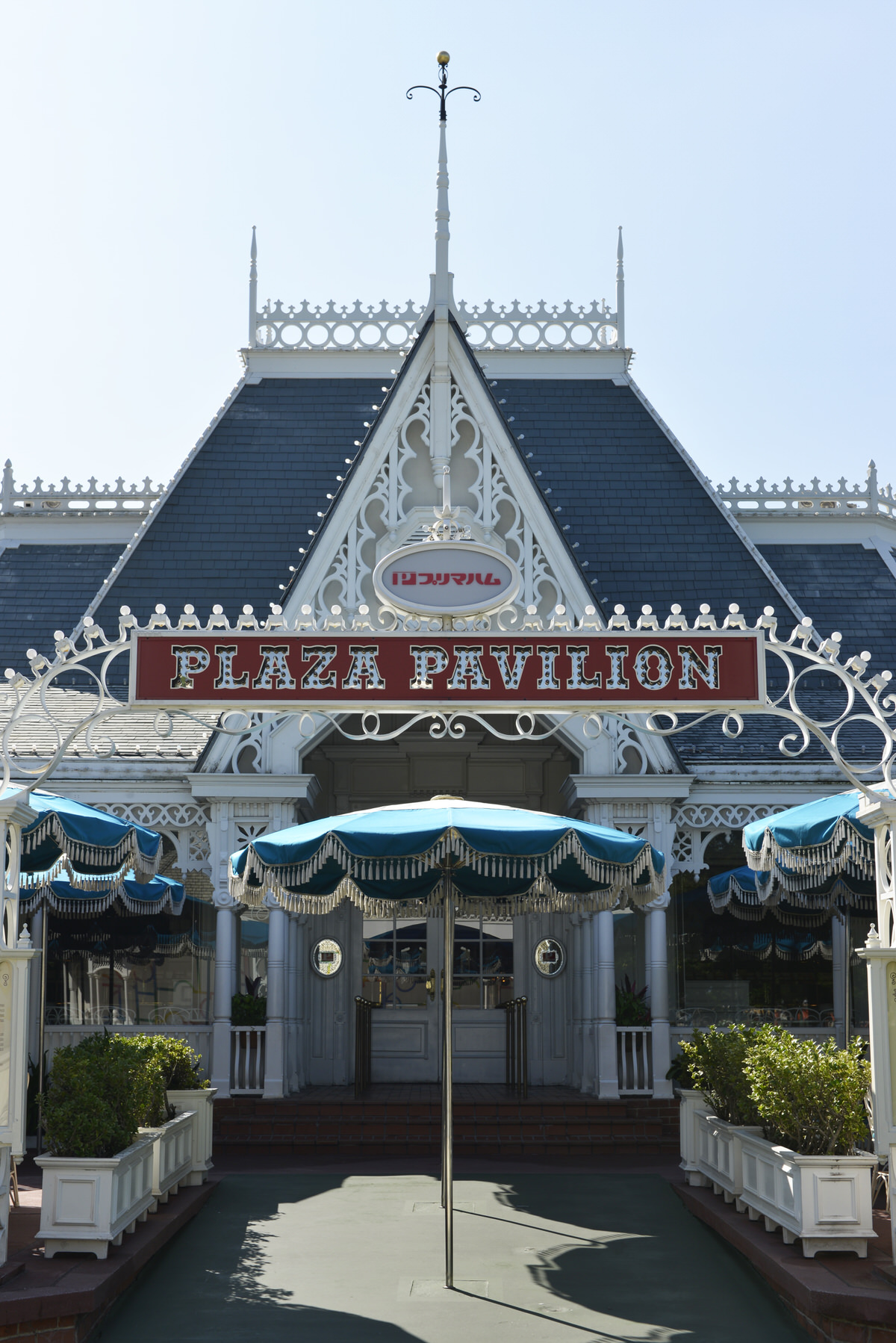 開拓時代のアメリカ西部に建つ、美しい装飾にふちどられた切妻屋根が目印の「プラザパビリオン・レストラン」