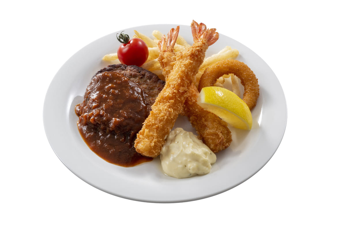 洋食メニューの王道、ハンバーグとエビフライを一皿にしたプレート。