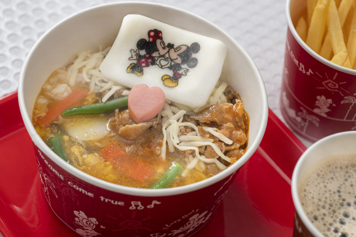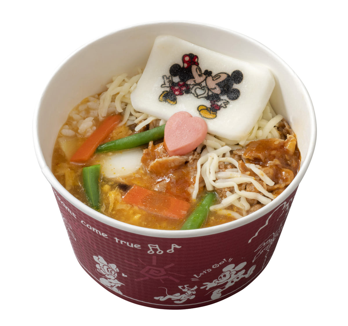 「ミッキーマウス」と「ミニーマウス」のおもちがトッピングされた「牛カルビクッパ」