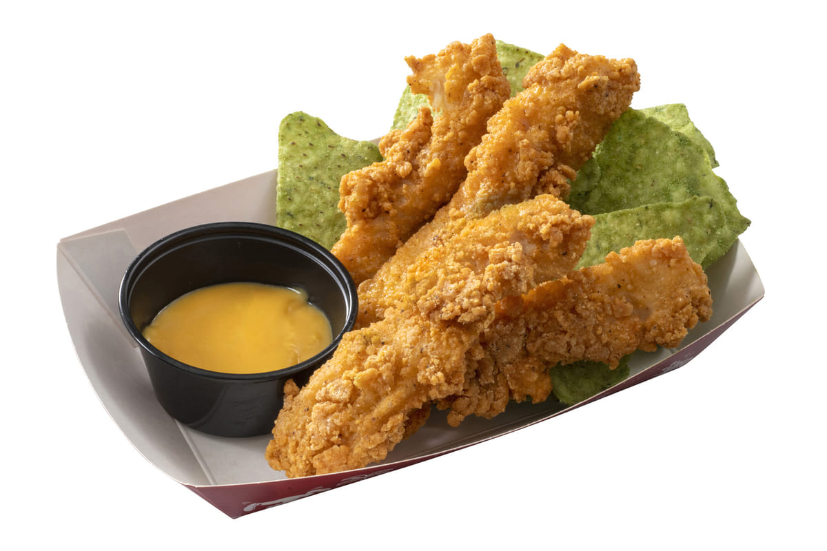 チーズソースをディップしていただく、チキンテンダー&コーンチップス。