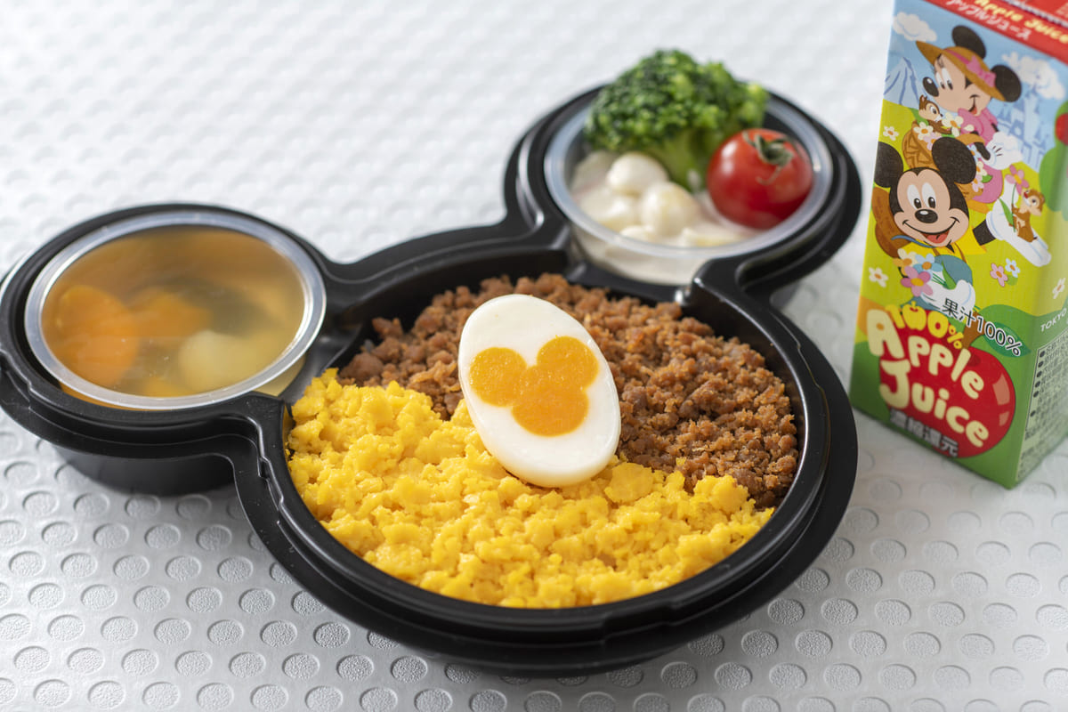 鶏そぼろライス、パスタサラダ、ブロッコリー、ミニトマト、フルーツゼリーがミッキーシェイプのお皿に盛り合わせになっています。