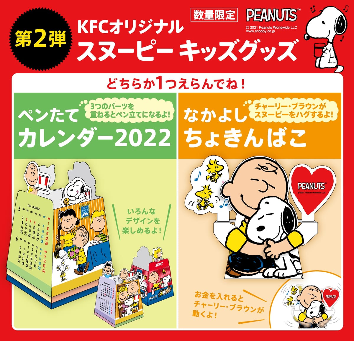 2021年12月27日(日)より、ケンタッキーフライドチキンのキッズメニューのグッズに「ペンたてカレンダー2022」と「なかよしちょきんばこ」が登場!