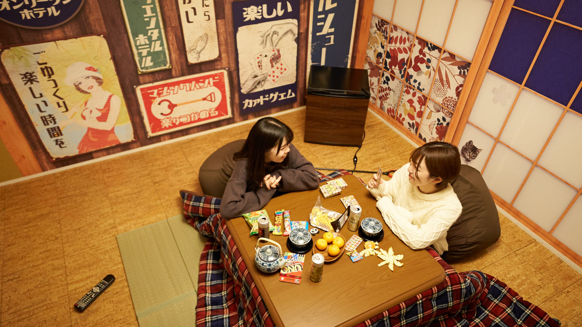 客室の中央には畳とこたつ、壁には昔懐かしいポスターが貼られているなど、ノスタルジックな時間が楽しめるプランです☆