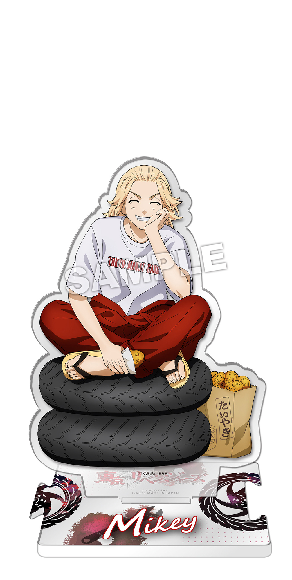 「マイキー」のアクリルスタンドは、重ねたタイヤの上であぐらをかいたポージング。