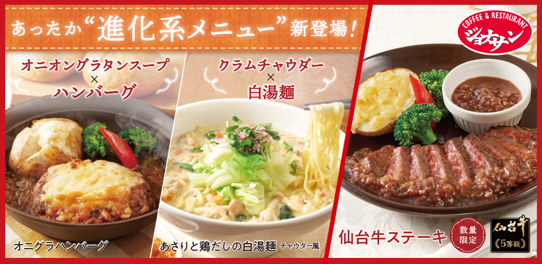 ジョナサンから、寒い冬にピッタリのあったかメニューと旨みが凝縮された最高等級のステーキが期間限定で登場!