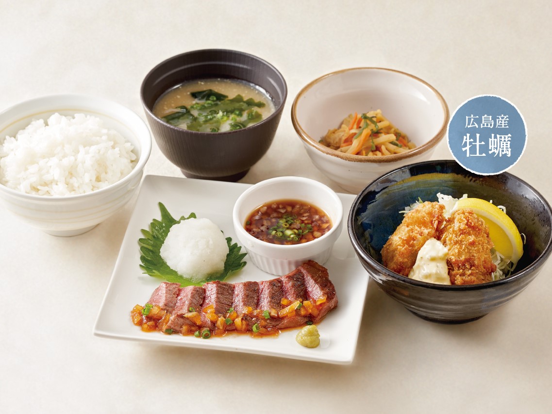 5等級仙台牛の赤身肉とサクサクの広島産牡蠣フライをお膳し立てに。