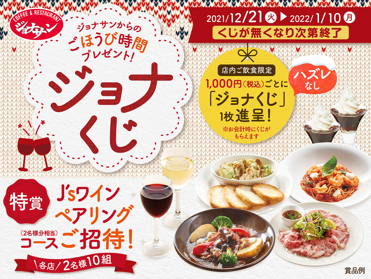 店内ご飲食1,000円(税込)ごとに、ハズレなしの「ジョナくじ(1枚)」をお会計時にお渡しします。※テイクアウト、宅配はキャンペーン対象外です。