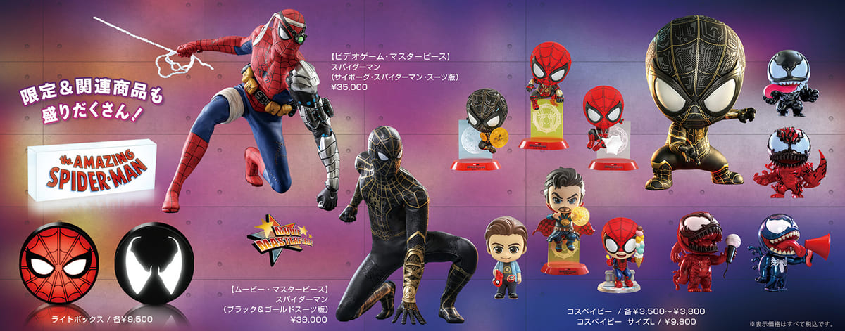 ホットトイズ製のリアルな造形のハイエンド1/6スケール可動式フィギュアや、デフォルメフィギュア「コスベイビー」「コスライダー」など、手頃なトイや雑貨から、ハイエンドなスタチューまで、「スパイダーマン」の限定&関連グッズが勢ぞろいします!