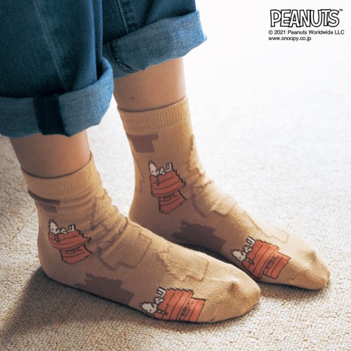 ブラウンのソックスは、「スヌーピー」が屋根の上で寝ているほっこりするデザイン。