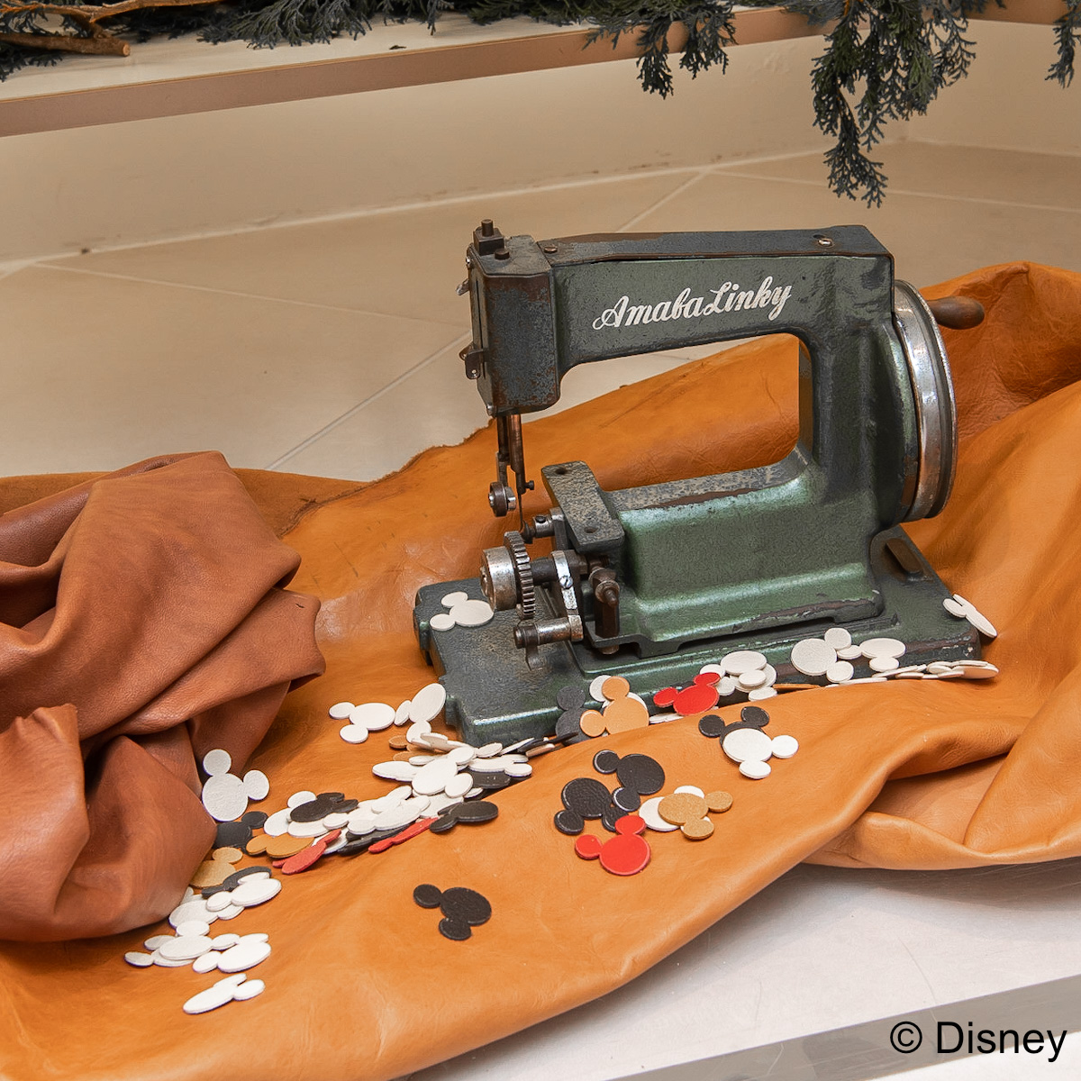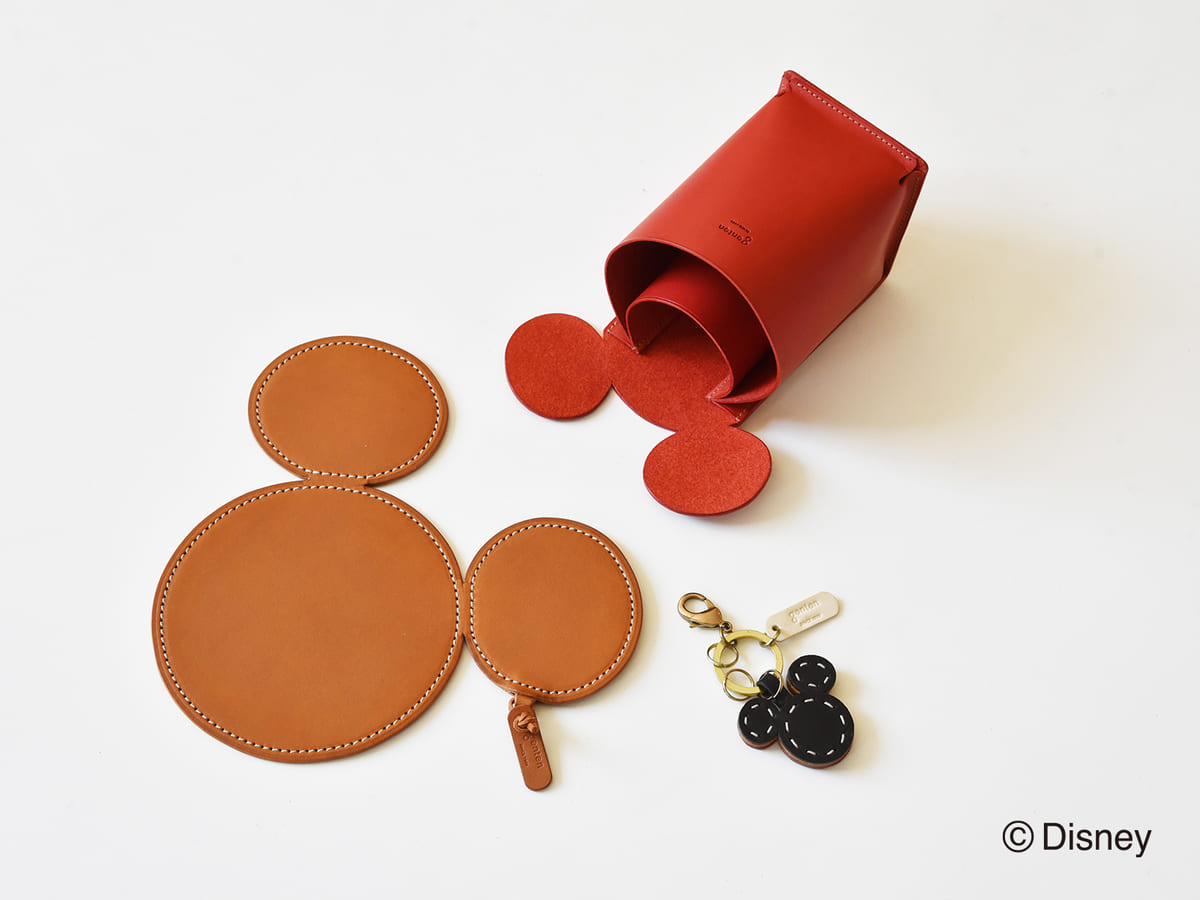 「ミッキーマウス」のミツマルアイコンのシルエットをモチーフにしたレザーグッズ。