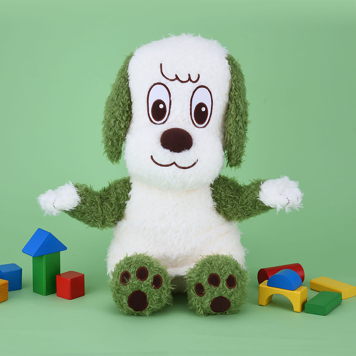 首をかしげたポーズが印象的な「ワンワン」のぬいぐるみ。