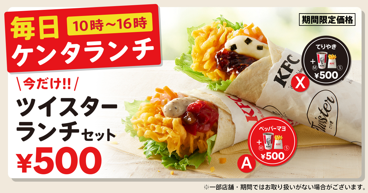 「ランチA(ツイスターセット)」と「ランチX(てりやきツイスターセット)」が、500円のワンコインで販売されます☆
