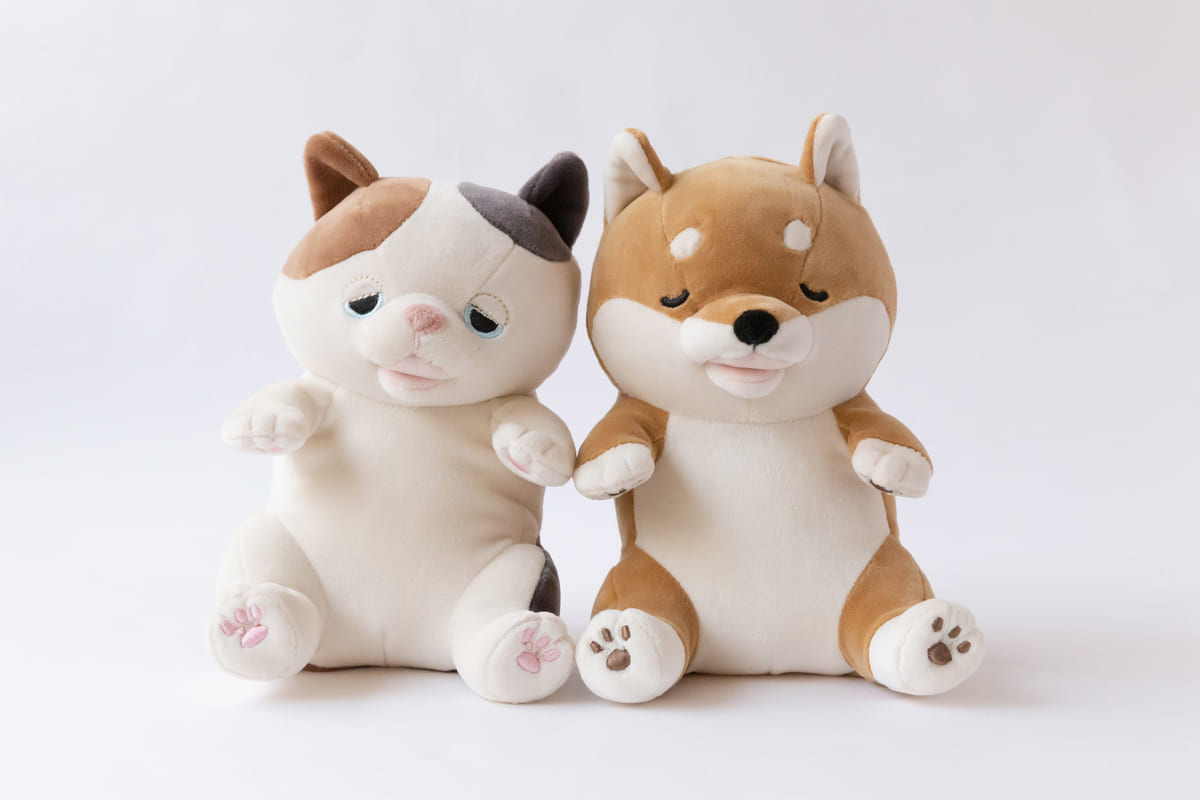 眠そうな表情をした癒やしの動物たちのぬいぐるみから、「ミケネコのゆず」と「シバイヌのコタロウ」が、「甘噛みハムハム」になって登場します!