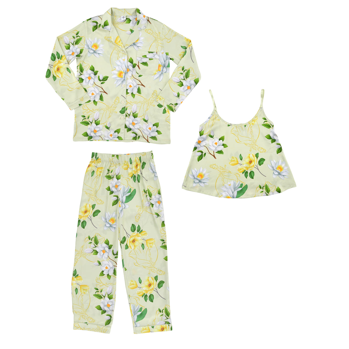 華麗なフラワーアートに溶け込む「ティアナ」が描かれたパジャマ3点セット。
