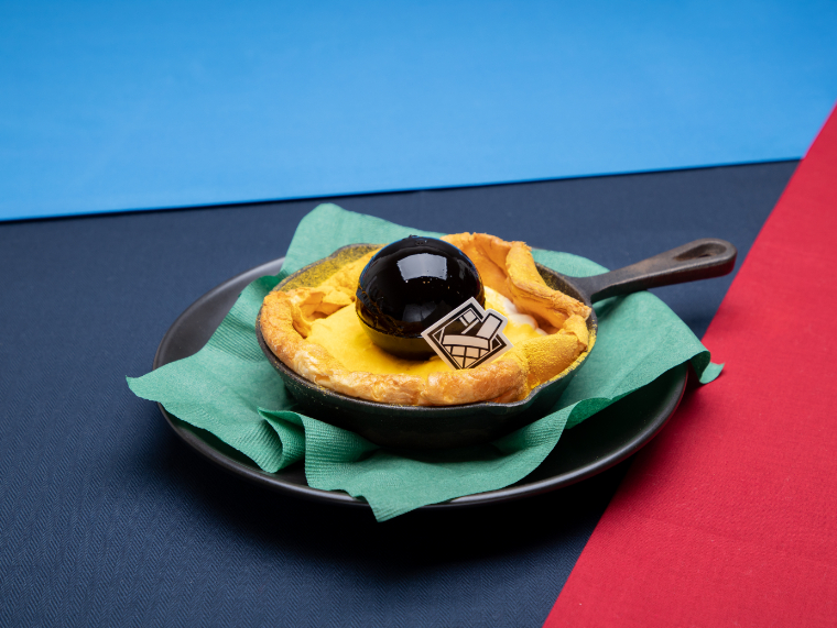 ダッチベイビーにマスカルポーネホイップと「夏油傑」の術式をイメージしたコーヒーゼリーをのせたホットデザート。