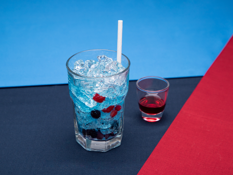 ブルーソーダにカシスシロップを垂らすと甘酸っぱいドリンクに変化します。